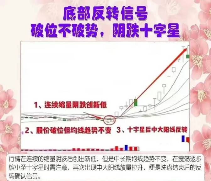 6、破位不破势,阴跌十字星:行情在连续的缩量阴跌后创出新低,但是中长期均线趋势不变,在震荡逐步缩小至十字星时需注意,再次出现中大阳线放量拉升,便是洗盘结束后的反转确认信号。