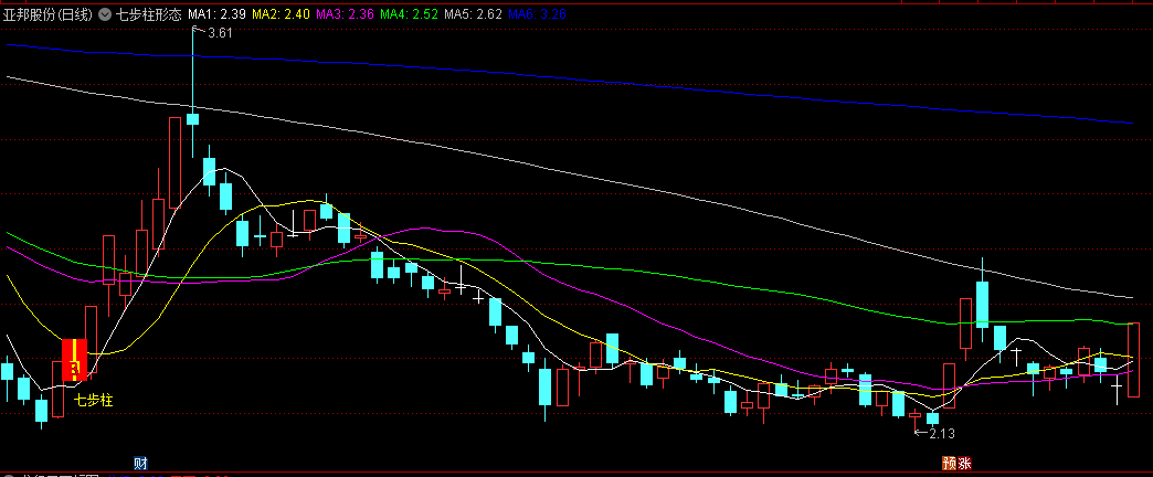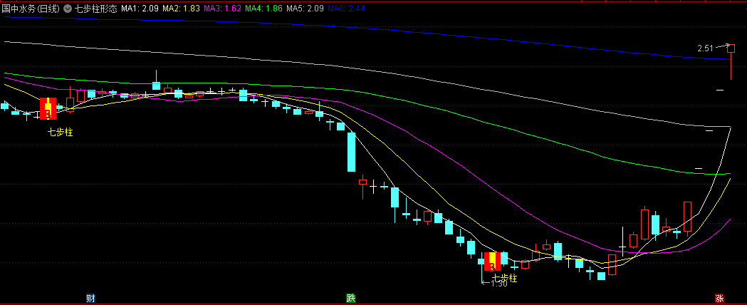 趋势预测:七步柱形态的出现为投资者提供了一个重要的市场趋势反转信号,预示着股票价格可能结束长期下跌,转而进入上涨阶段。这对于判断市场底部、把握反弹机会具有重要意义。