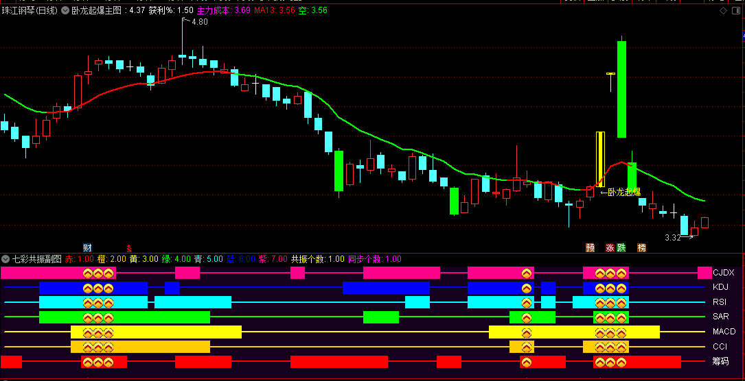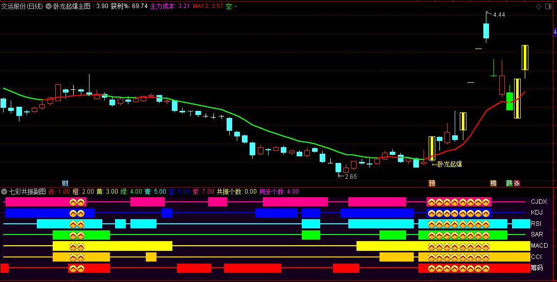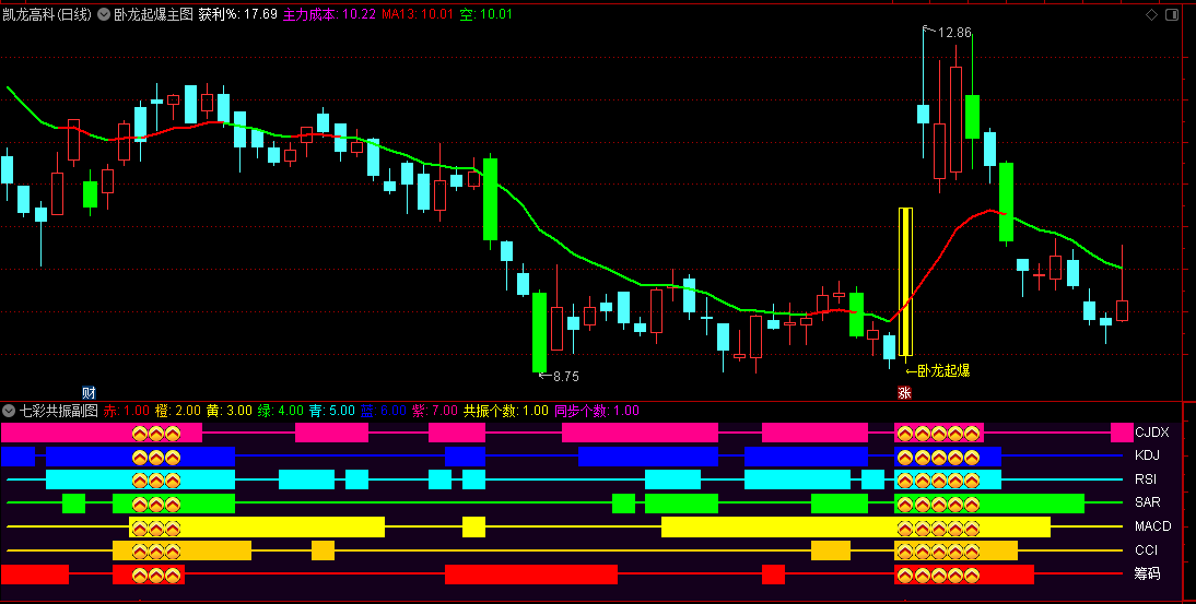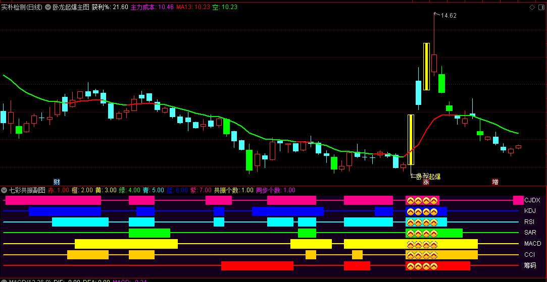 1、七彩共振副图:包含CJDX、KDJ、RSI、SAR、MACD、CCI、筹码七个信号共振,成功几率大增!