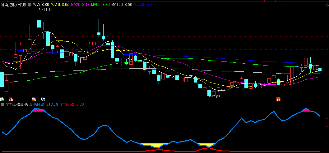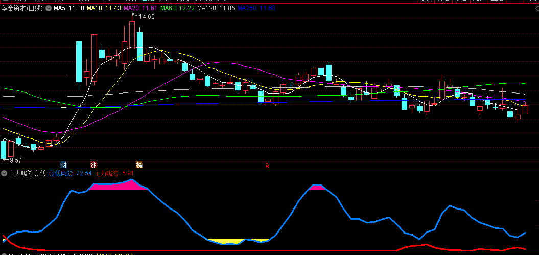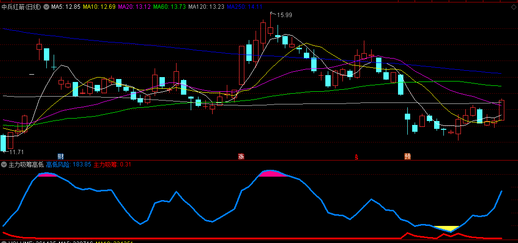 〖主力吸筹高低〗副图指标 红线箭头吸筹信号出现 蓝线下方有黄色填坑信号 无未来!