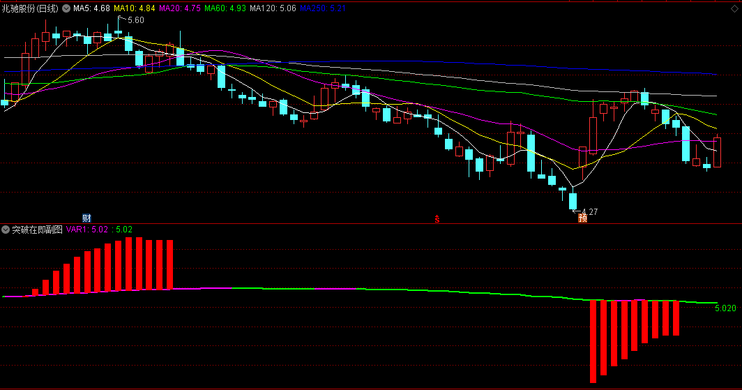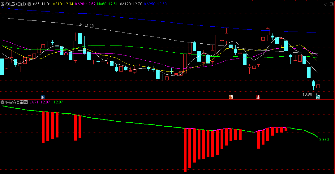 绿线变成紫线,且伴随红柱子陡峭向上拉升,就是强势突破形成!