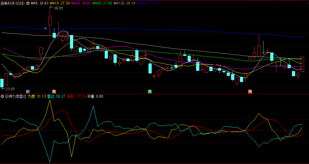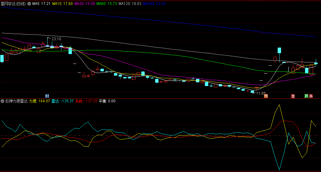 橙色力度线上穿蓝色雷达线,表明反弹力度增强,应予以关注!