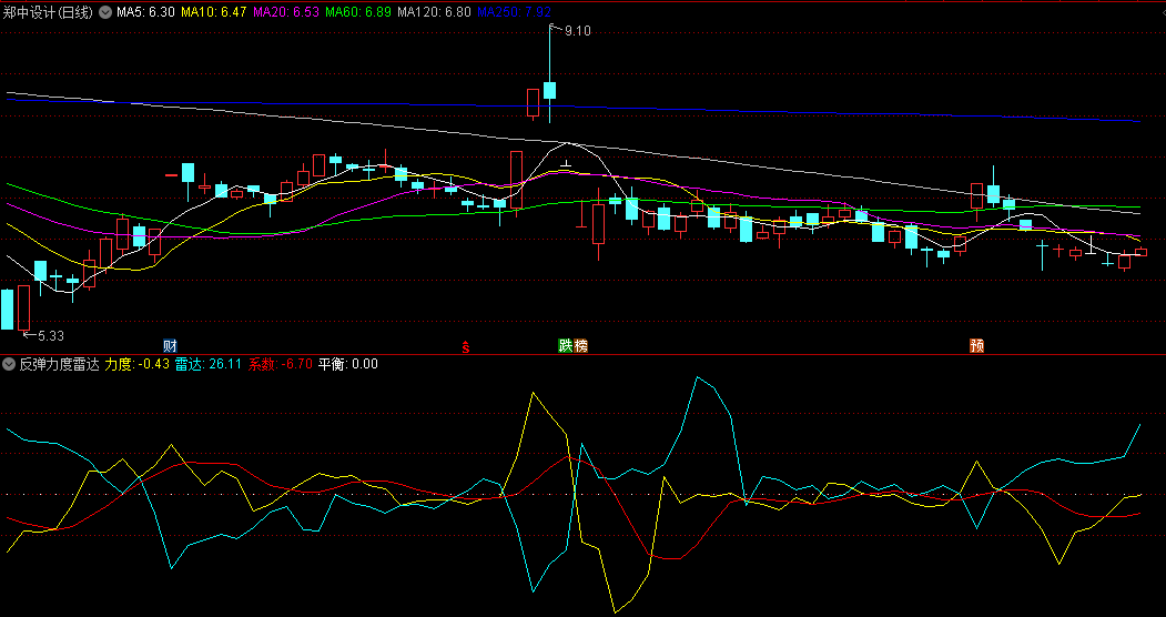 反弹力度雷达副图指标,橙色力度线上穿蓝色雷达线,表明反弹力度增强,应予以关注!