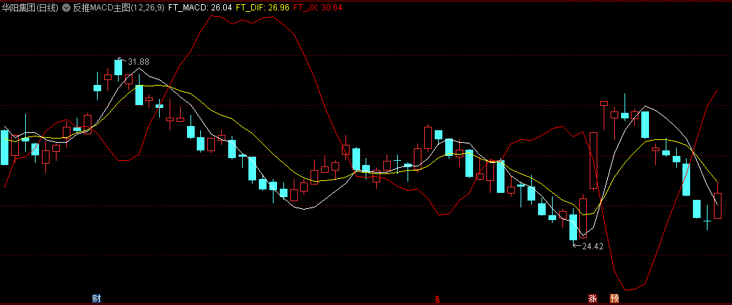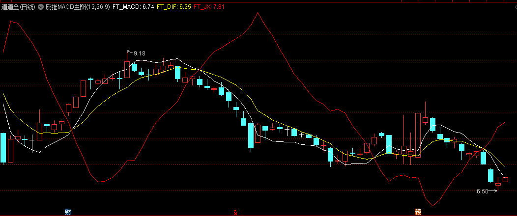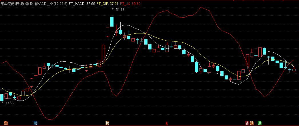 看到一位名叫平面大虫的大神很早很早发的一个关于反推MACD的帖子,心生一计,把反推MACD放到主图,这样子就一目了然看到MACD趋势跟当下价格结合到一起了,如下图: