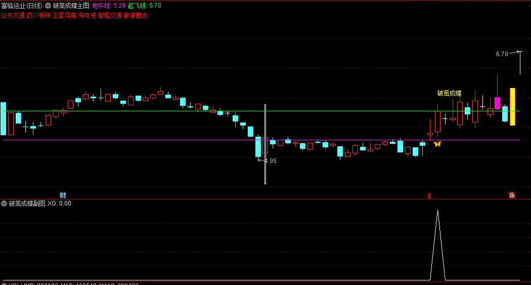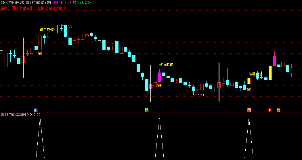 3、图中的K线下方出现了一个“蝴蝶”图标,同时上方显示了“破茧成蝶”四个字,这两个元素的同时出现,暗示着这是一个买入的良机。