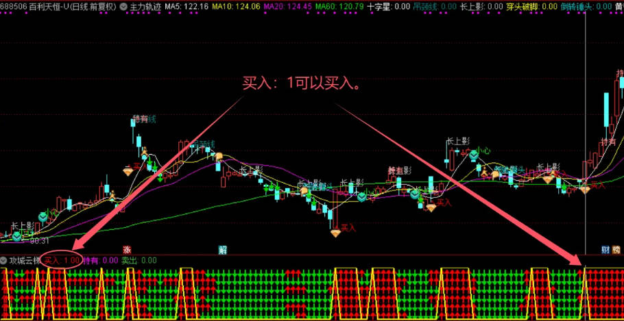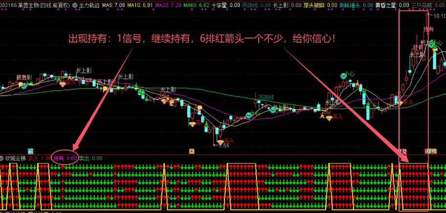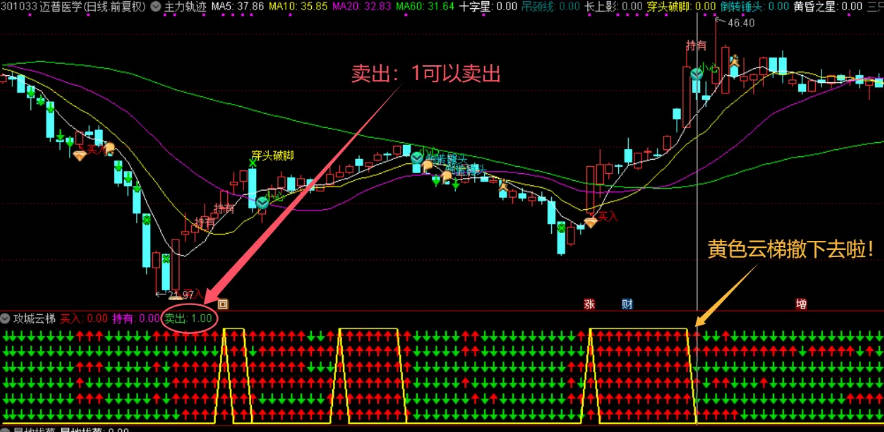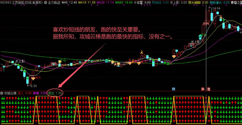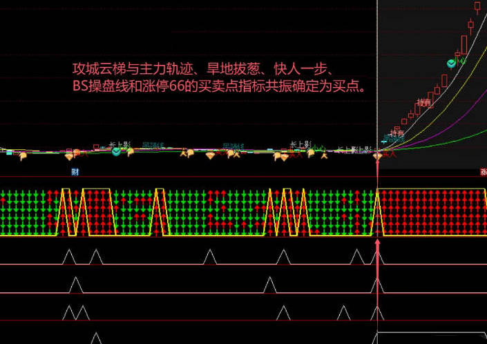 攻城云梯副图指标,用6个传统指标制作而成,一排排红箭头整齐排列,宛如木匠的祖师爷鲁班为楚国攻打宋国制作的云梯一样。云梯竖立起来,开始攻城,云梯一撤下去,攻城结束。攻城云梯副图指标是做短线的好指标,买在关键位,卖点更精准!传统指标有极大的生命力,理解的好,运用的好,比现代流行的指标更有价值。攻城云梯有许多亮点,特别是“买点”,至今我所有见到的指标中无出其右。买的好不如卖的好,买点指标更珍贵。