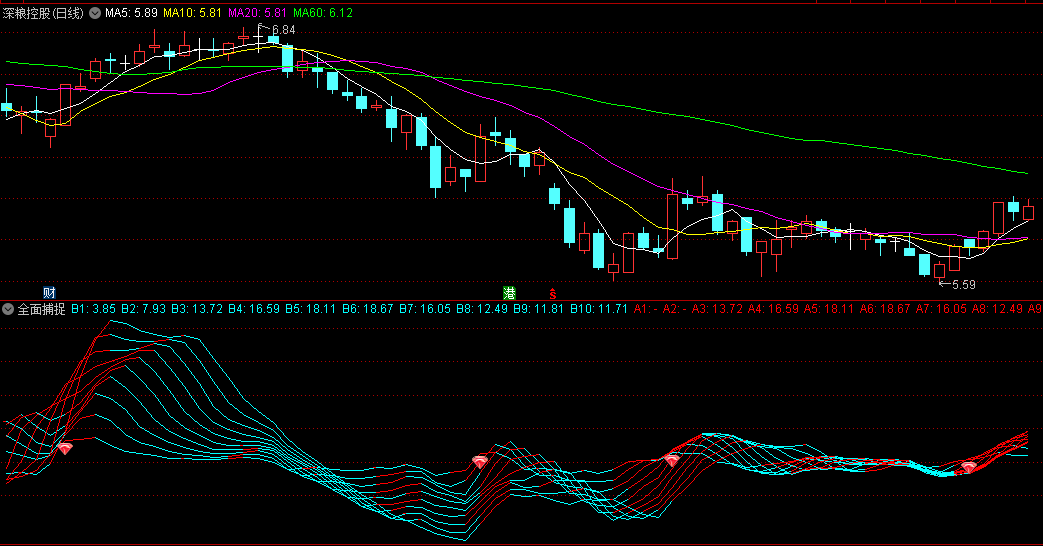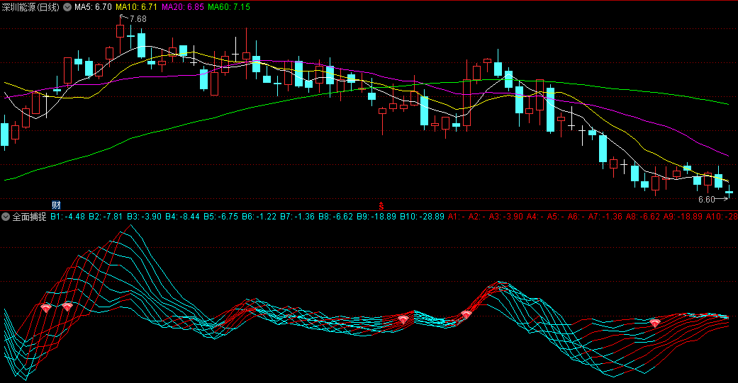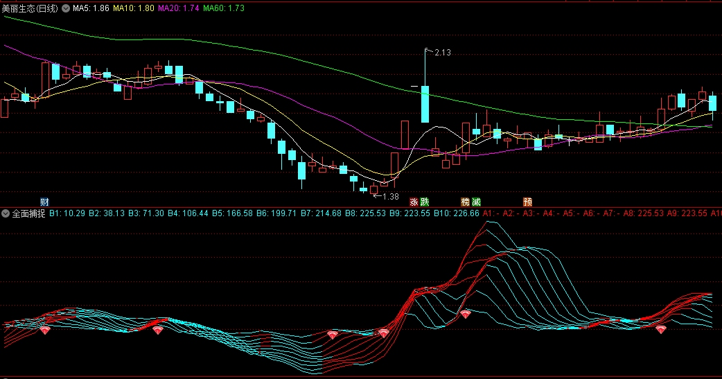 本幅图指标通过复杂的线条交织,形成类似渔网的视觉效果,故命名为“全面捕捉”。这些线条综合反映了市场的多种动态,帮助投资者全面把握市场动态。