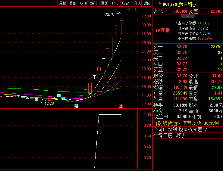 3.形态以及买卖点:形态选择好之后,看看分时图,入股此时分时白线是回踩黄线不破并处于上升趋势,而且持续有大单买入,这就是要在尾盘买进的强势个股,次日冲高获利高抛即可。
