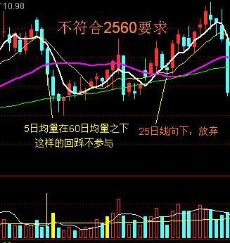 2560战法有两个最基本的条件:一是25日均线必须向上;二是5日均量线必须在60日均量线之上,只有同时满足这两个条件的股票,才符合2560战法的要求,才能根据以下条件买进。