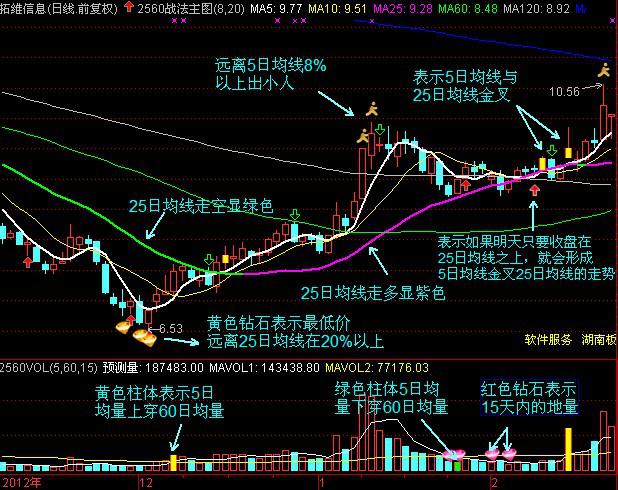 主图中的白色粗线表示5日均线,粉红色粗线表示25日均线,当25日均线向下时就变成了绿色的了,所以25日均线是否向上也就一目了然了。