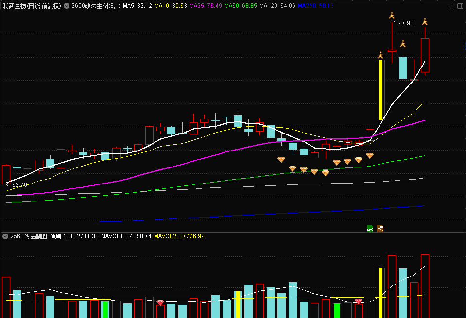 看了这段文字,大家应该明白什么是2560了—–即25天均线和60天量线。这也就是2560战法。