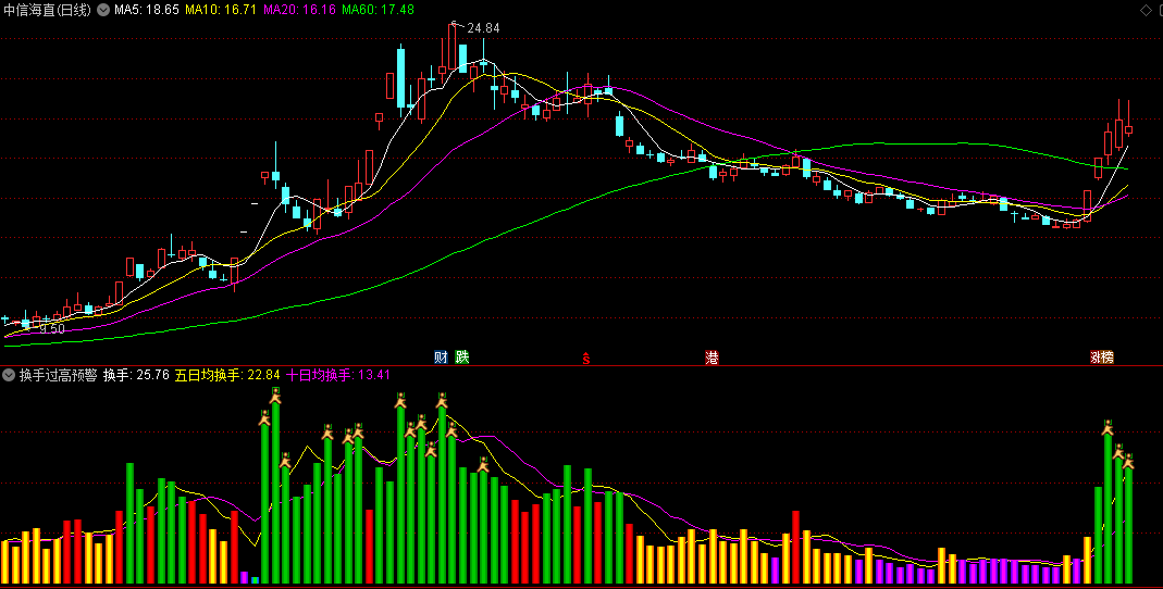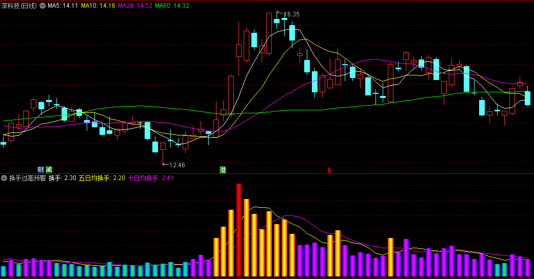 根据不同级别的换手率,用不同颜色的柱子显示,当换手率过高,出现转空迹象时,发出小金人的信号,提示你跑路。