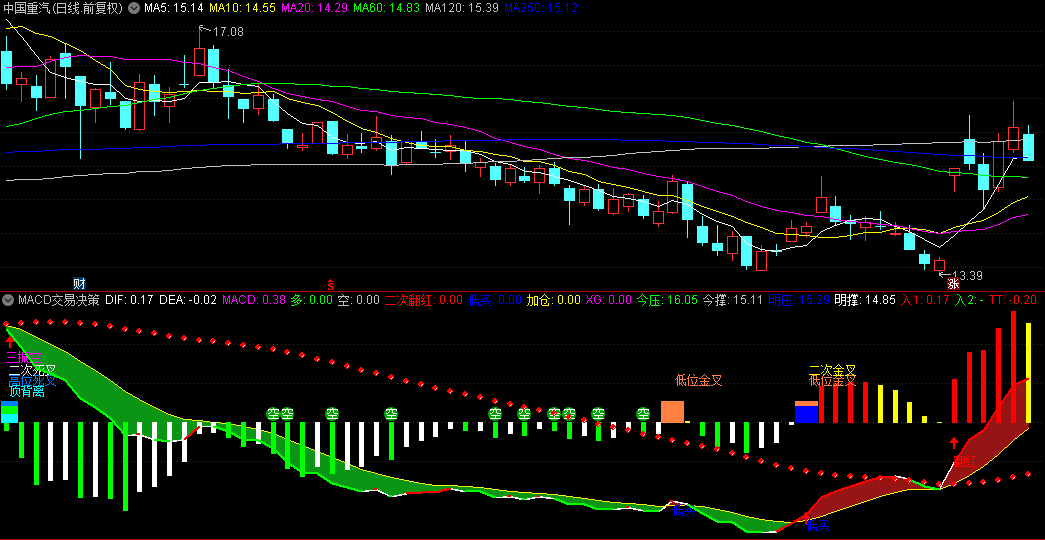 买卖点判断:通过金叉、死叉等信号判断买卖点。低位金叉表示买入信号,高位死叉表示卖出信号。二次金叉和二次死叉则是对金叉和死叉的进一步确认。