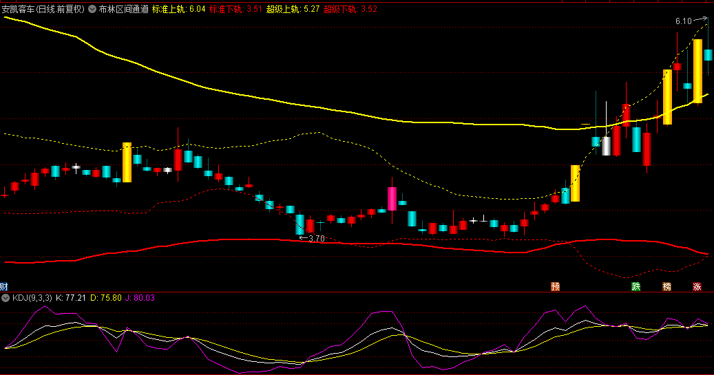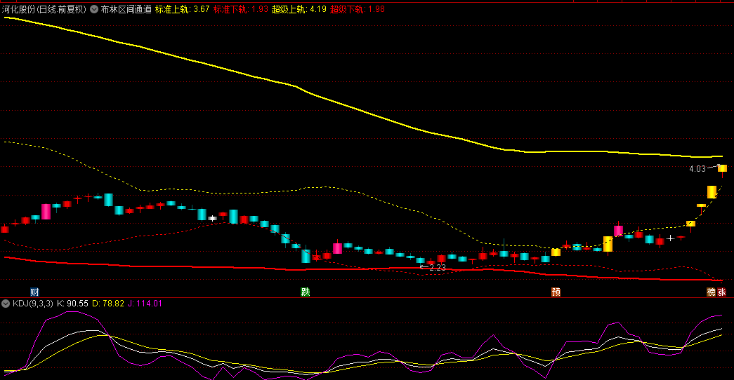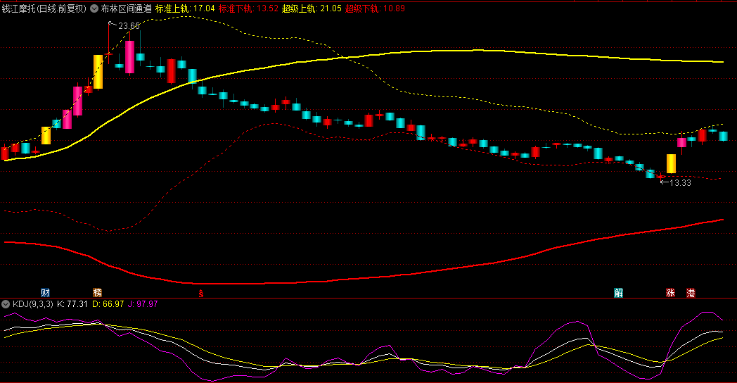 布林区间通道主图指标,为你画出区间的支撑线和压力线,轻松掌握哪里是支撑位,那里是压力位!