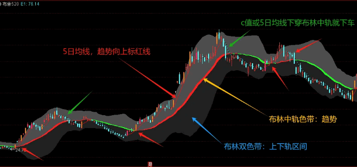 两个指标有共性部分,在这里将这两个指标整合为一。用两个色带代表布林带与中轨的趋势。