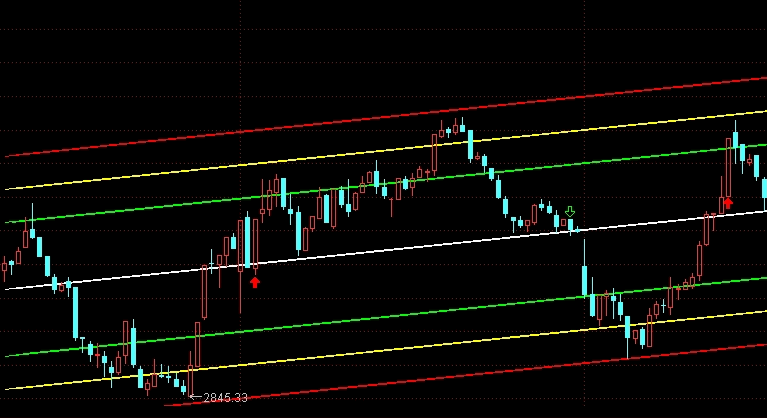 所以,如果发现有落在红线外面的K线,概率是小于5%的。如果发现这种情况的话顺势做多或者做空,盈利的概率就比较大。