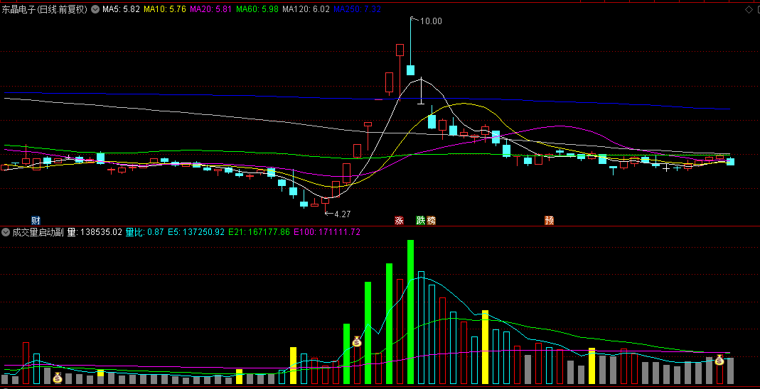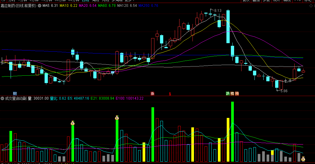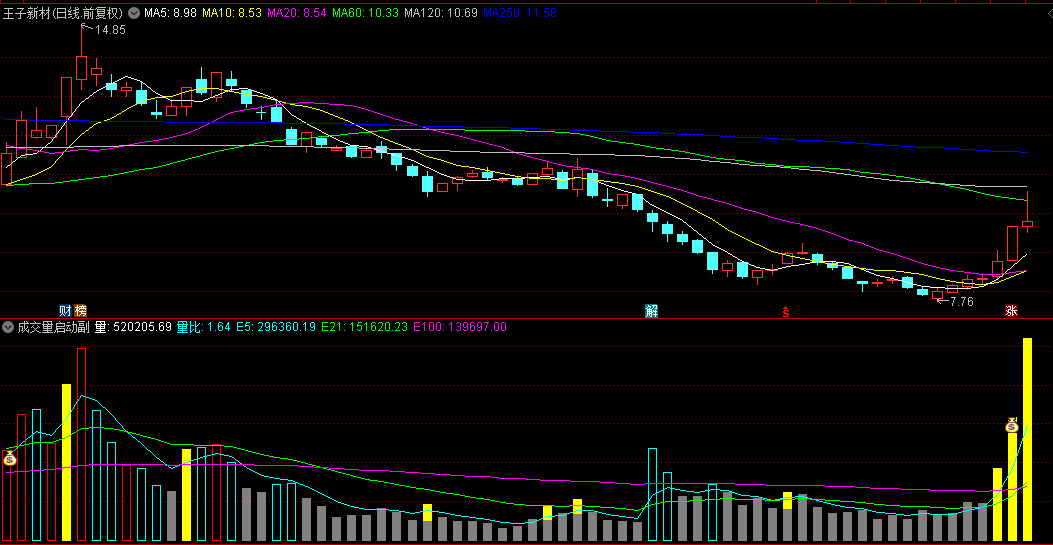6、“钱袋子”信号可以用来打板或今买明卖都,或做主升启动点等,可结合这个量能指标一起参考。看个股所处的位置,放天量出的信号就要小心了。