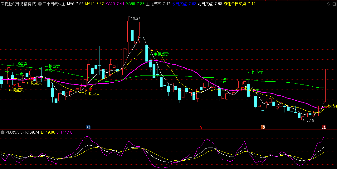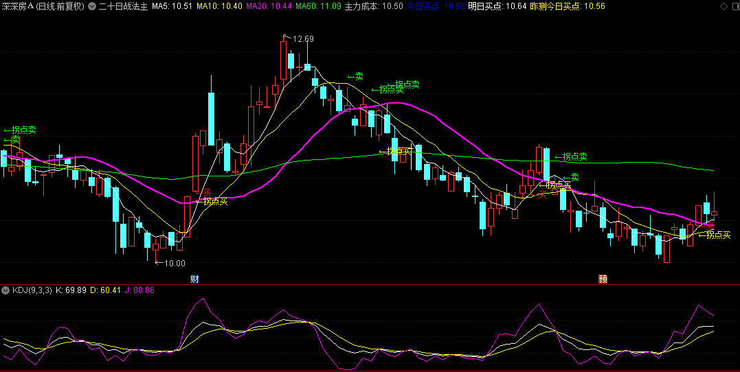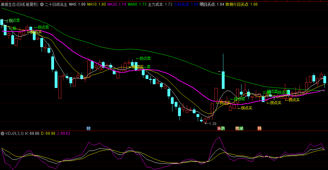 为了方便大家看盘特在20日均线加上买卖点,20日均线又称为万能均线,即它的意义在于周期不是很长也不是很短,所以能够真实反映出股价的最为接近的趋势,他的低位拐弯意味着短期内趋势有好转的迹象,股价如果能够即时站稳于上就说明股价未来看涨,否则只能代表趋势纯技术上的空头趋势。这一均线是经过长时间验证其在股价间的变化作用,能在任何时候任何位置给出一个明确的操作买卖信号,这也是"万能"二字所在的真实含义。万能均线之所以万能是因为它在股价的任何时间和位置都能准确的给出操作信号。它的操作要点在于只要股价上穿万能均线并且有成交量放大的配合被认为买入信号,股价下破万能均线被认为卖出信号。在周期组合上被认为是一个综合周期,因此无论是长线投资或者短线投资均适用。
