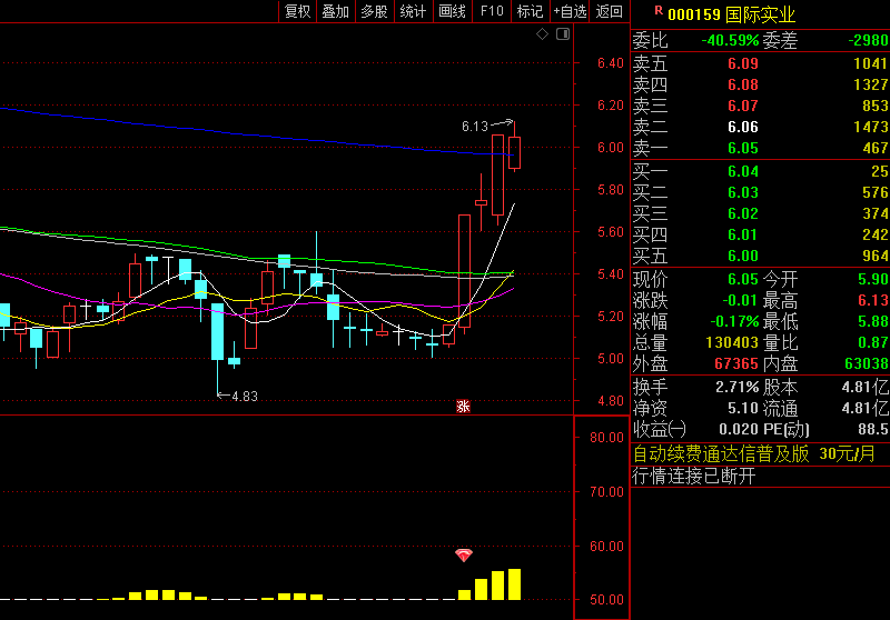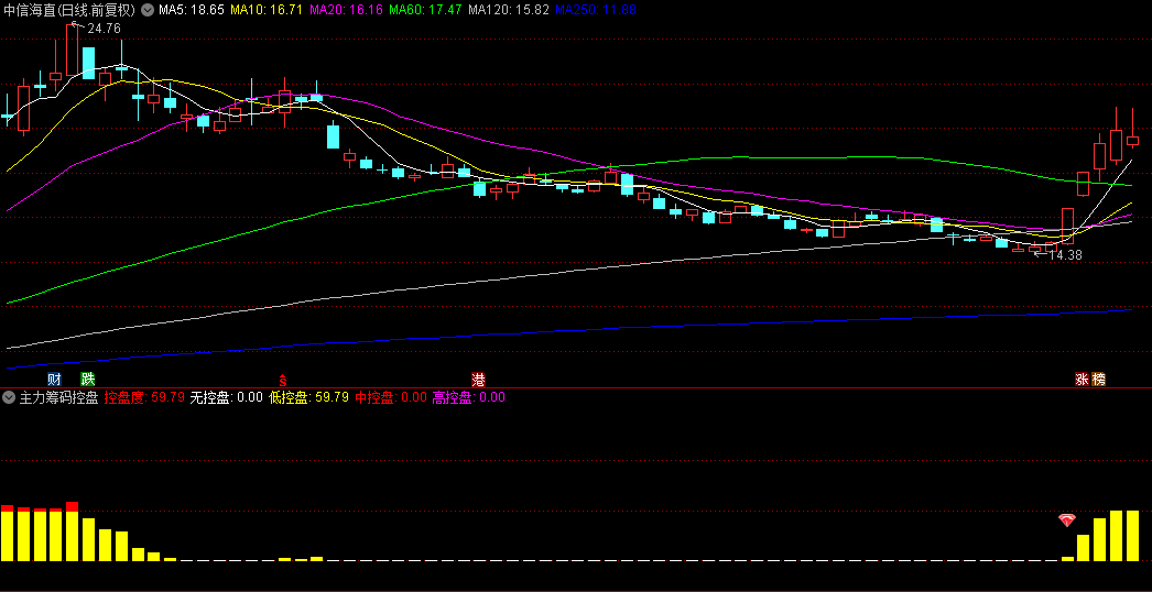 指标中,柱子分为白、黄、红三种颜色,白色柱子是无控盘状态,股价波动无规律,黄色柱子第一次出现,是开始控盘的标志,黄色柱子连续增加,表明控盘力度连续增强,增强到一定程度,变为黄色叠加红色柱子,继续增强,到极强状态,是黄色、红色和子时叠加,此时也是最容易出现见顶的信号,经常会有核按钮,要小心;