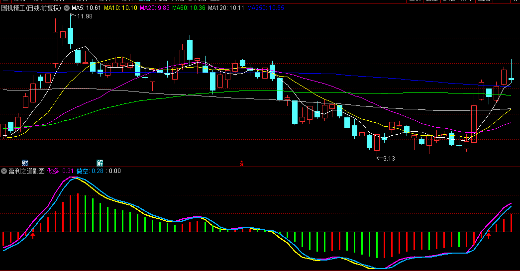 此策略,我们称之为“盈利之道”副图指标,它如同一位智慧向导,引领您在股市中稳健前行。当画面上那抹黄色线条优雅地穿越蓝色做空线,并华丽转身变为粉色做多线之际,正是您果断介入、拥抱盈利机遇的最佳时刻。相反,若黄色线条与蓝色做空线不幸分离,形成死叉,且粉色做多线重归蓝色做空之态,则是您应当审慎评估,适时空仓避险的信号。