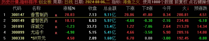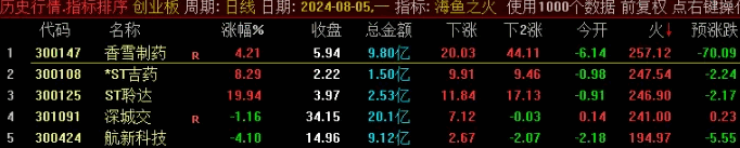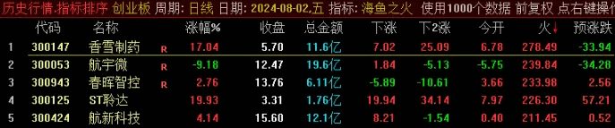 《海鱼之火》排序指标,大资金游资最想要的指标,全网开盘定尾盘,全天不变,预测当天涨跌。经常有涨停股。
