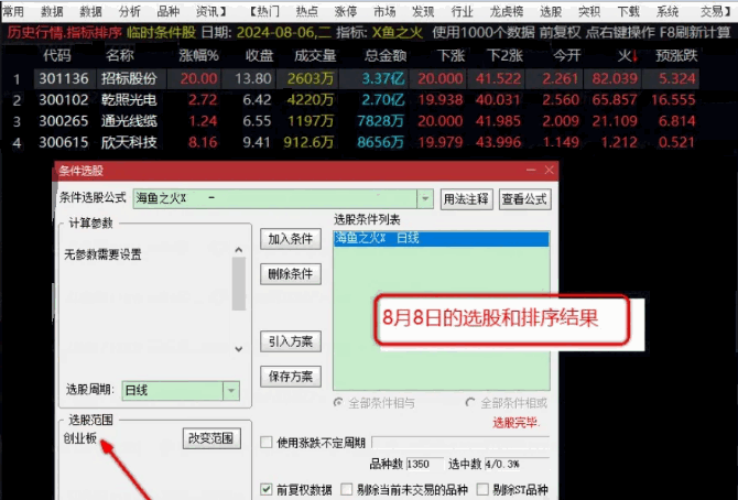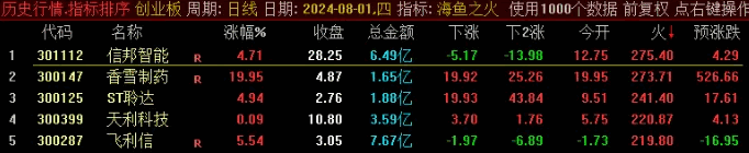 《海鱼之火》排序指标,本指标不限制其他版块,但是个人喜欢创业板,只研究创业板。火排序成功率比较高,“预测涨跌”概率就是60%左右。不要一开盘就买进,最好是尾盘买入,但是可以在根据盘面等情况确定今天上涨的概率非常大,甚至会涨停,可以盘中逢低买入。