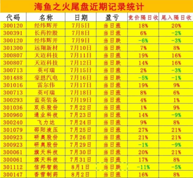 海鱼之火公式只是总结得出,虽然参考了游资牛人的操作,不是常胜将军,不作为投资建议,更不担保未来是否一样有如此高的概率,只适合研究强势中寻找今天买明天卖的模式,不是人人都能驾驭得了的。