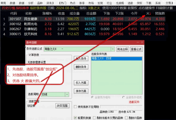 本版本是最新更新优化版,不是网上的原始版,全套指标包含了海鱼之火X3优化创业板选股、海鱼之火X6优化版主板选股、海鱼之火指标排序、海鱼之火6优化版主板副图、