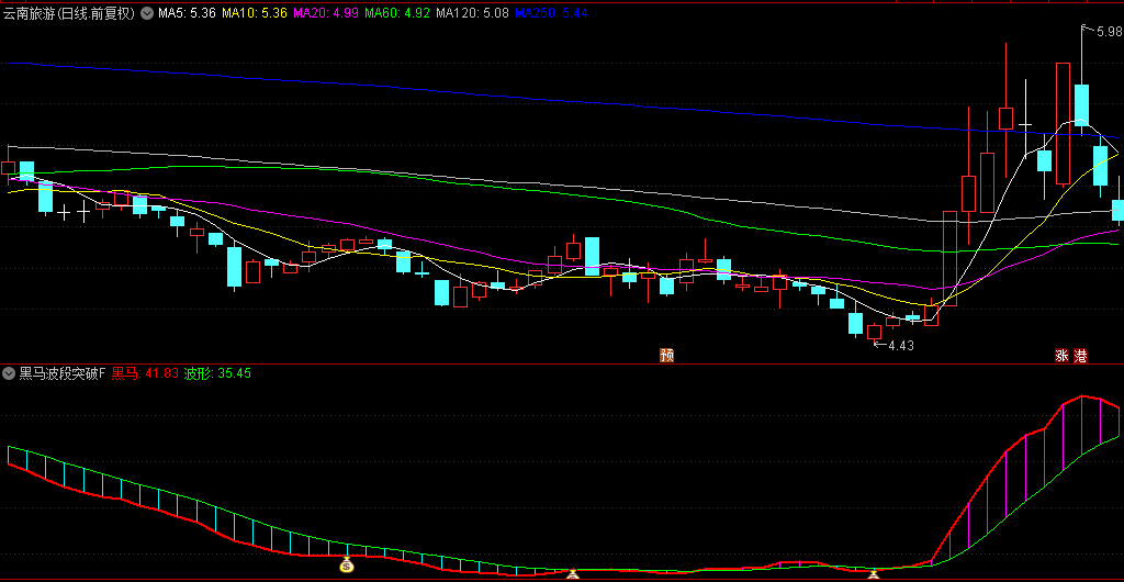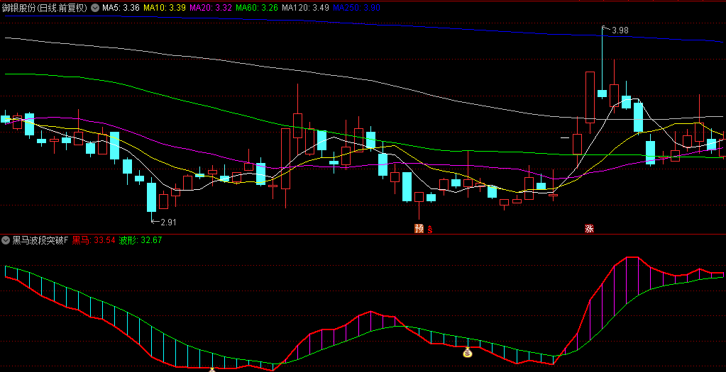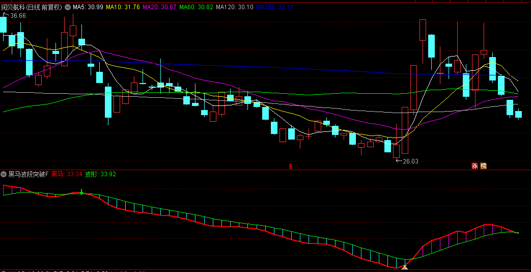 副图中,红线表示黑马线,绿色细线表示波段线,黑马线由下而上上穿波段线表示股价进入拉升区间,钱袋子表示黑马买入信号,绿色箭头离场或减仓信号。