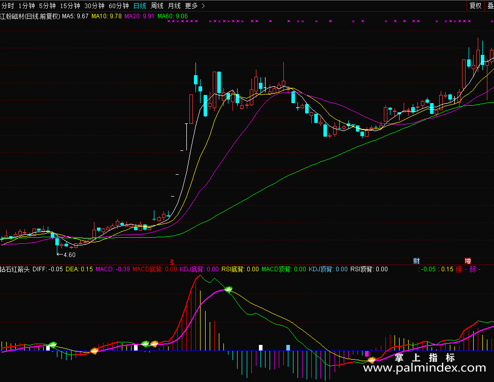 弱:IF(DEA>MA(DEA,2),DEA,DRAWNULL),COLORMAGENTA,LINETHICK2;