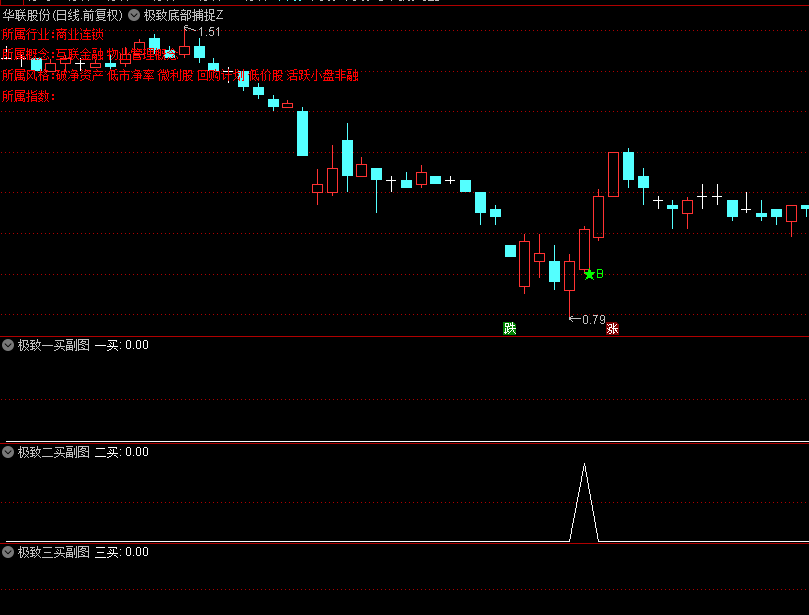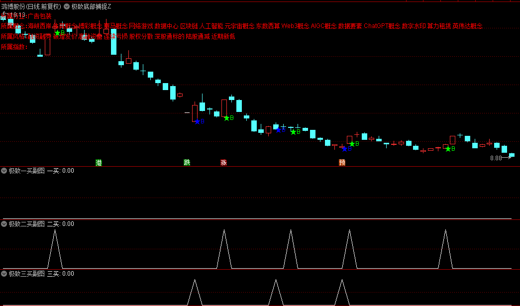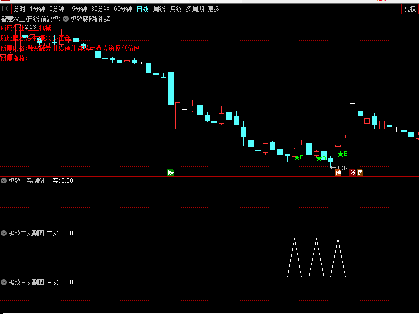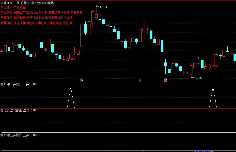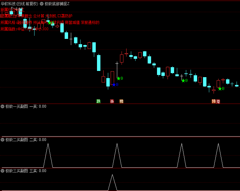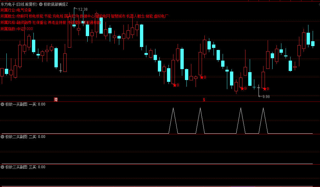 本策略的核心——极致底部捕捉主图指标,巧妙融合了均线理论与量价乖离分析,精准定位市场底部区域,并在这些黄金机遇点上以醒目的五角星标记买入点,同时辅以“B”点确认,直观展现。此指标独树一帜,设计了三种不同色彩的买入信号,分别是红色、黄色与绿色,每种颜色都承载着特定的市场解读与操作指引。