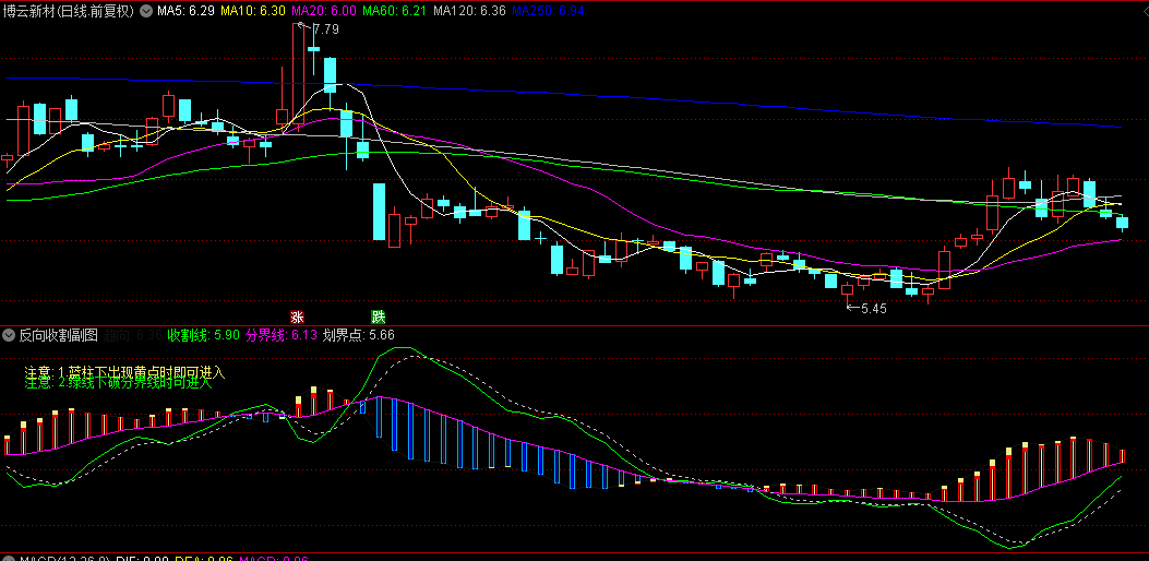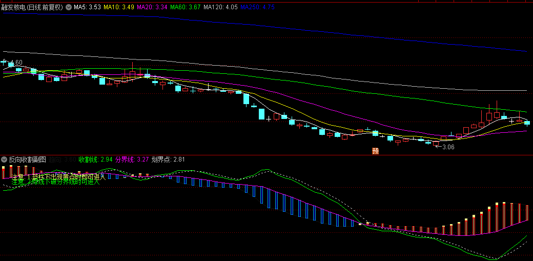 〖反向收割〗副图/选股指标 蓝柱下出现黄点时即可进入 绿线下破分界线时可进入!