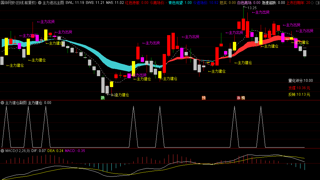出现主力出场信号后,灰色K+蓝色飘带离场;
