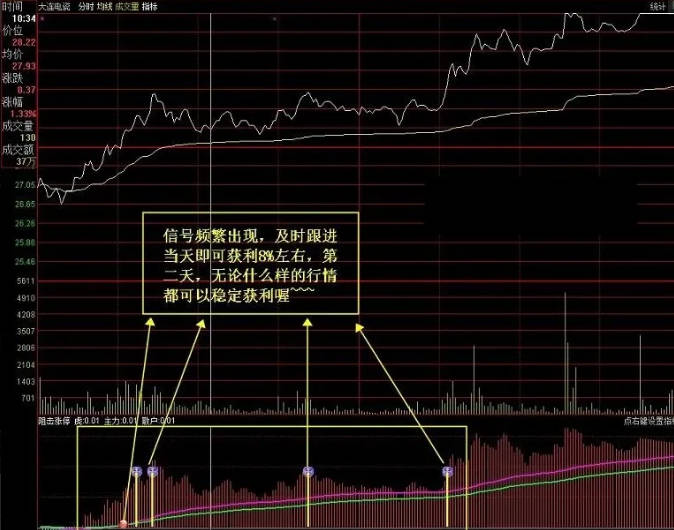 1.九点三十开盘后打开涨幅榜从高向下选看那只股第一次出现买入信号买入。