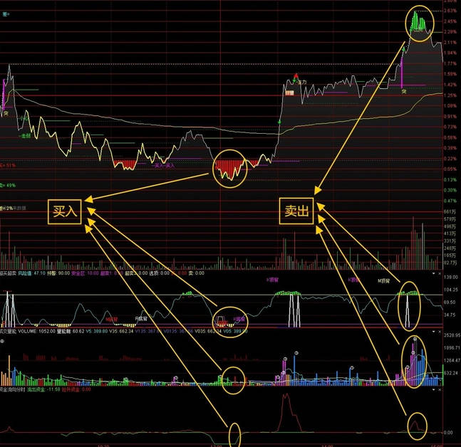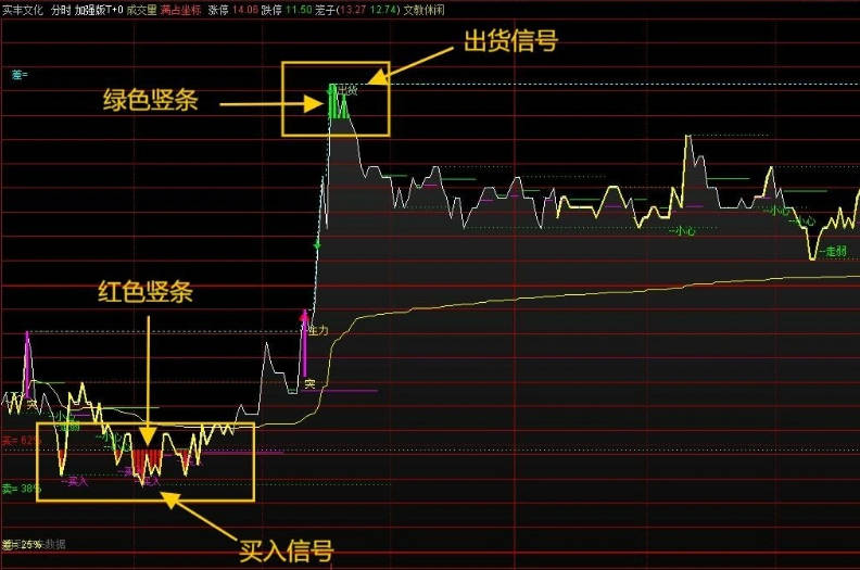 当股价上涨至日内新高时会发出“绿色竖条”信号,遇到压力位将要回落时会发出“出货”信号。