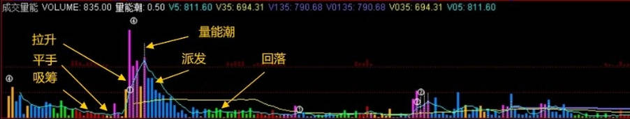 绿色柱为“回落”,白色虚线是量能潮,量能潮增大时股价会随之拉升。