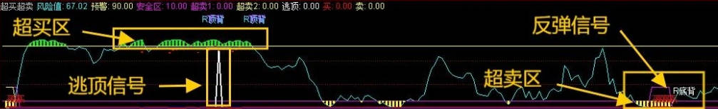 2.超买超卖指标(副图):当风险值(淡蓝色线)在黄色线上方为“超买区”,以“绿色竖条”表示,当出现“白色信号”预示将要“逃顶”,