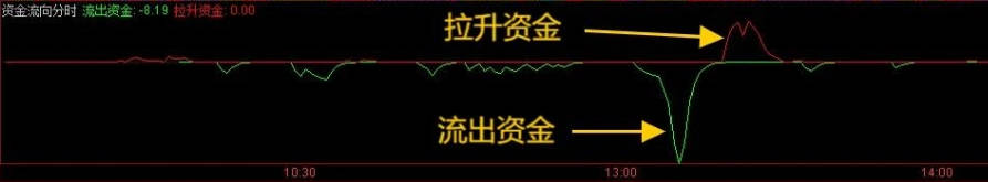 4.资金流向指标(分时):这个指标很直观,红色线为“拉升资金”,股价上涨时,拉升资金>0, 股价不涨时,拉升资金=0;