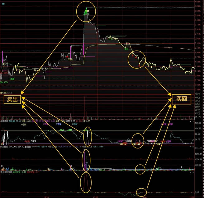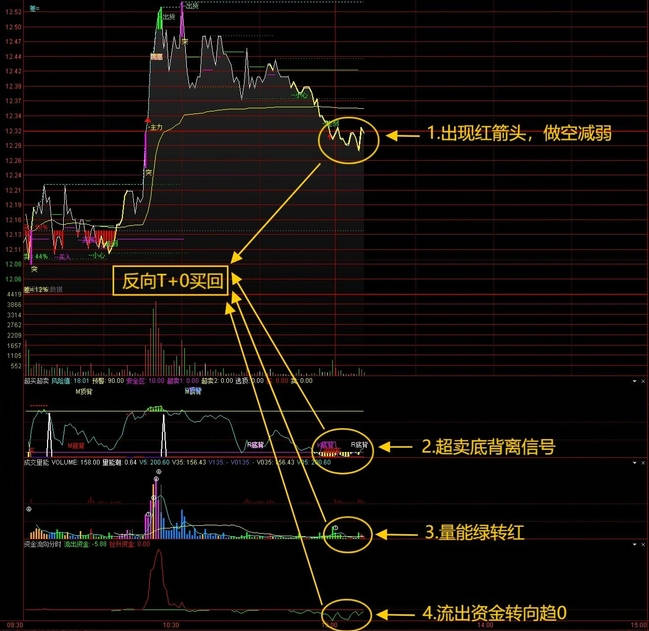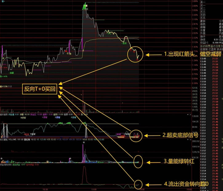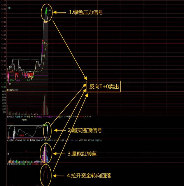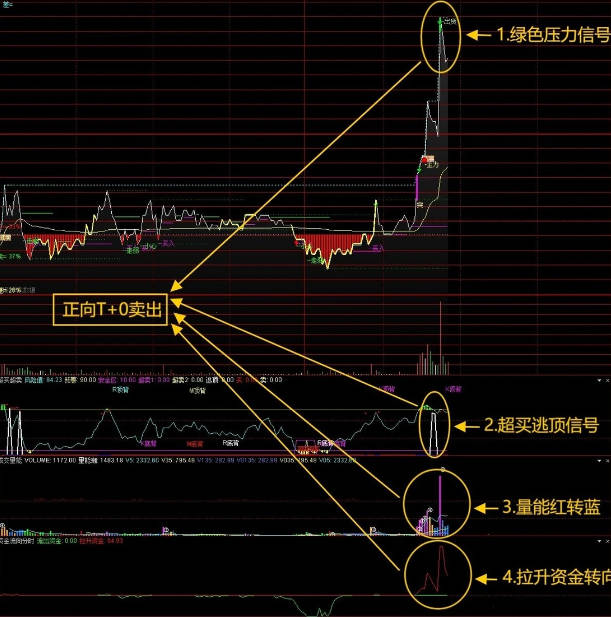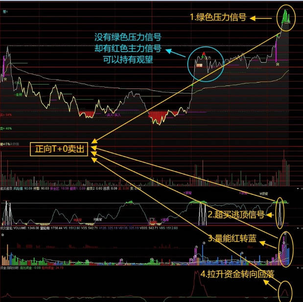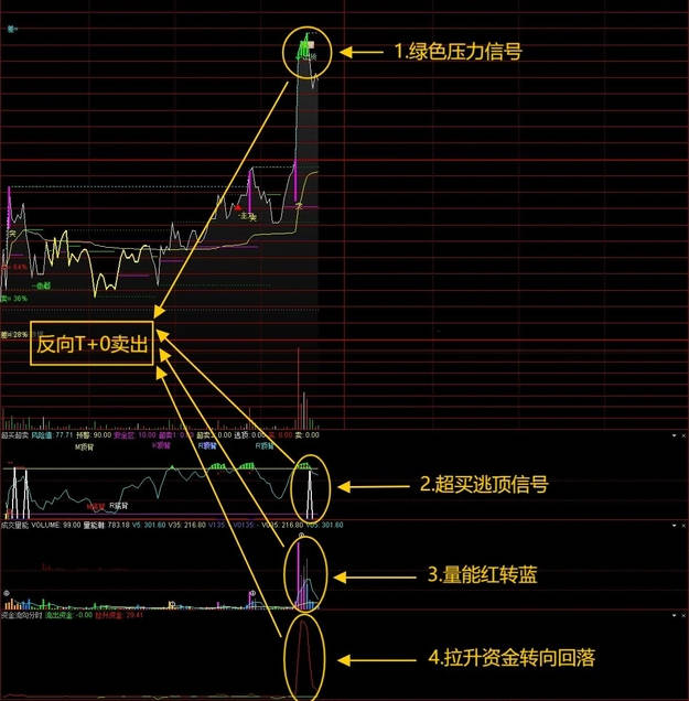 当日内股价上涨中出现1.加强版T+0指标(主图)绿色压力信号.2.超买超卖指标(副图)超买区白色“逃顶”信号.3.成交量能