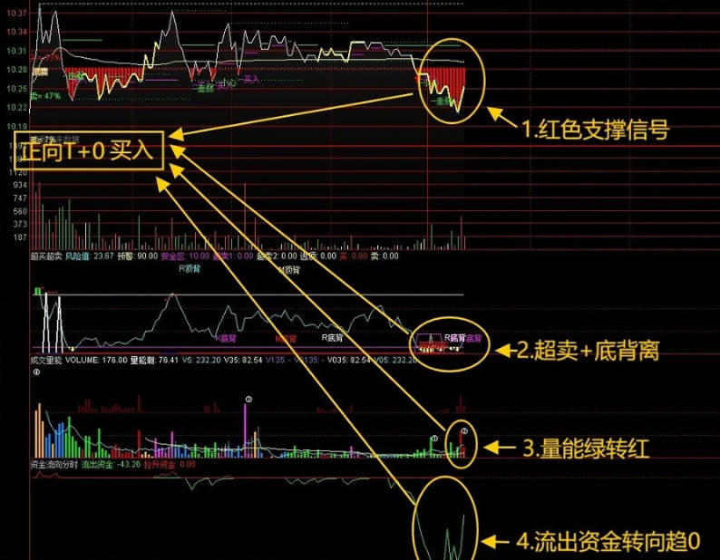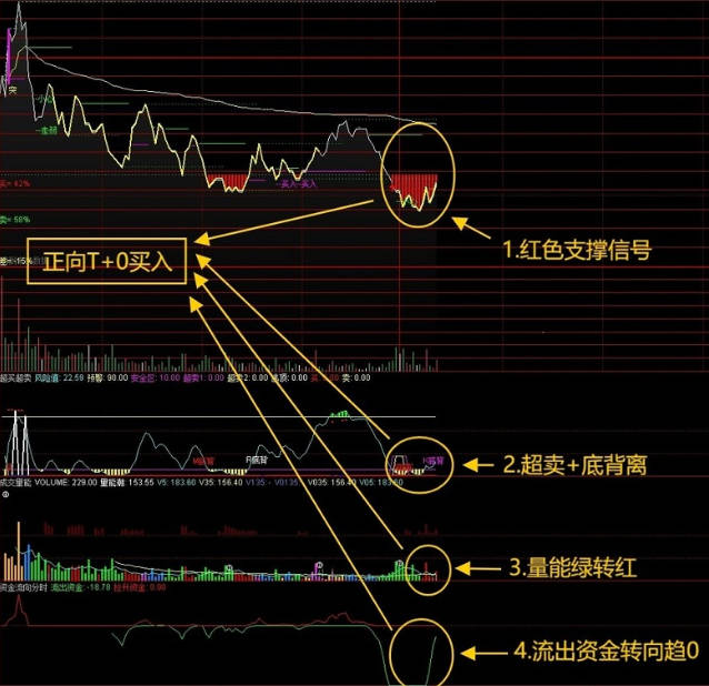 当日内股价下跌中出现1.加强版T+0指标(主图)红色支撑信号.2.超买超卖指标(副图)超卖区红色“买”信号.3.成交量能