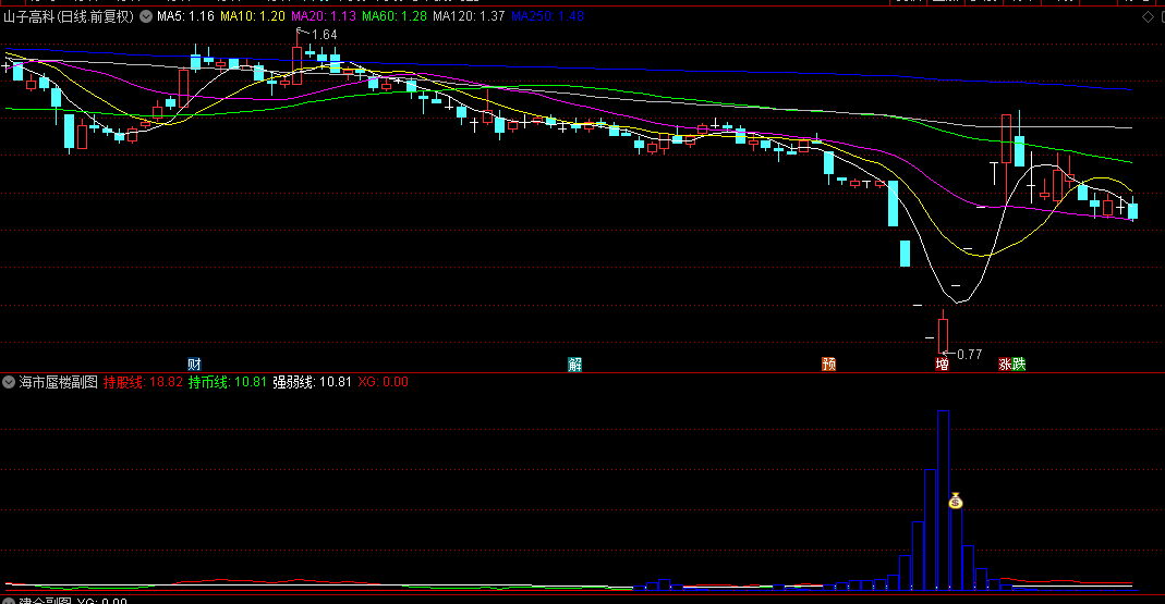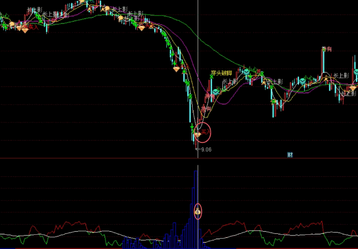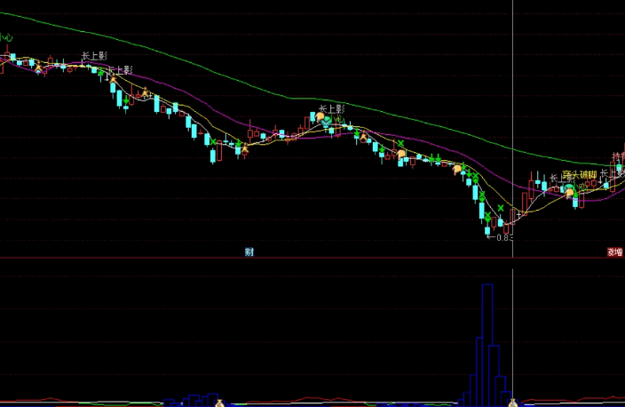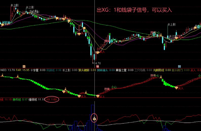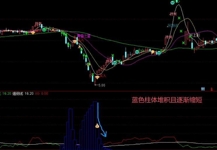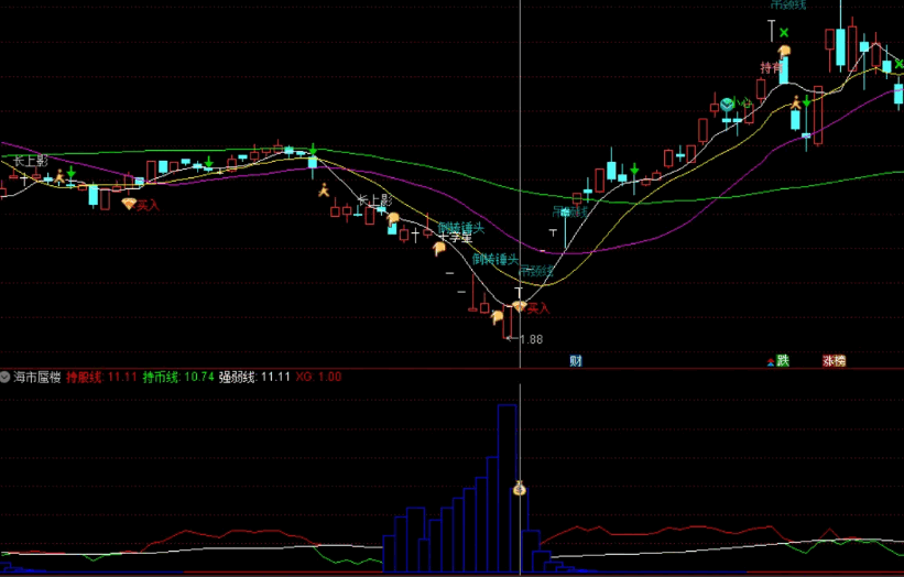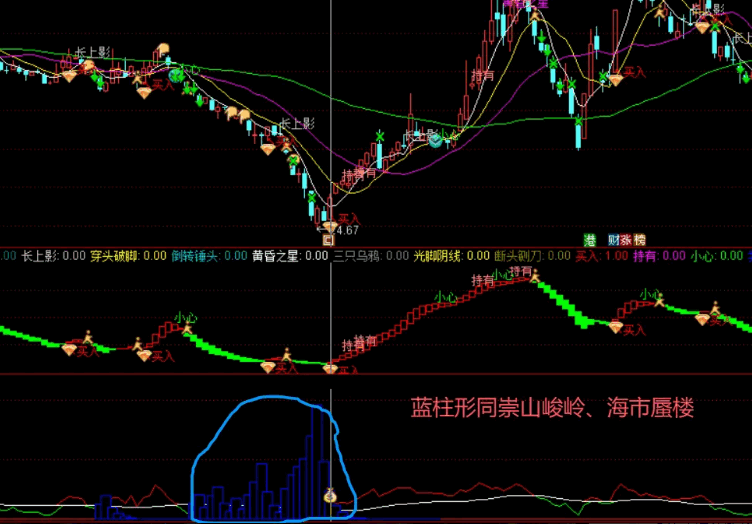 蓝色柱体堆积,如同海市蜃楼。然后柱体缩短,出买入:1和钱袋子信号时,可以买入。