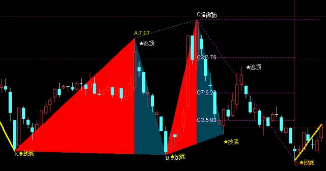 AB边是XA的38.2%或61.8%回撤位,BC边是AB边38.2%或88.6%回撤位,CD边是BC边224%或361.8%扩展位。
