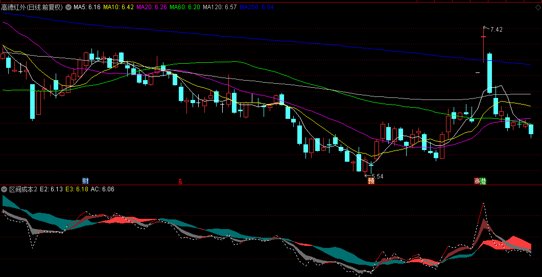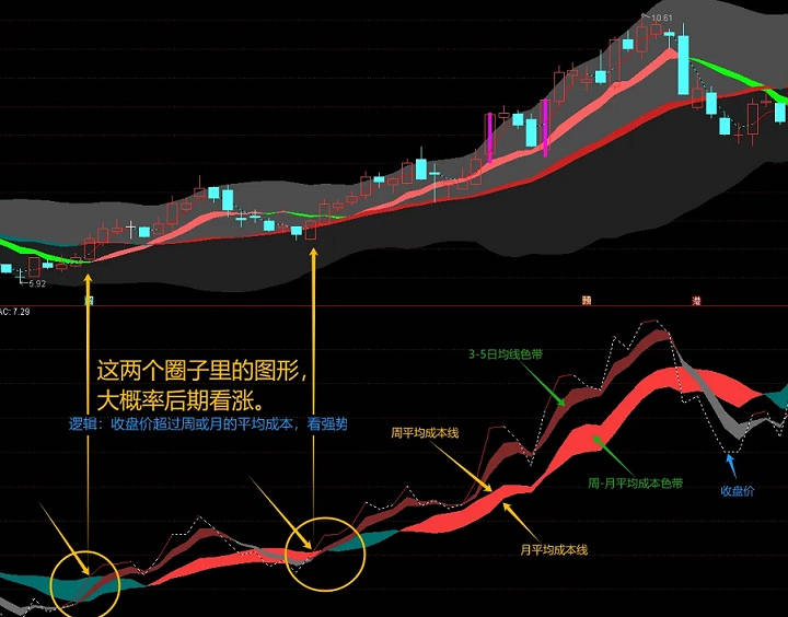 周或月内的股票都有它的区间成本,而这两个成本线形成的色带,有很强的趋势性,价格与这个趋势性的色带的上下关系就是我们需要的方向。