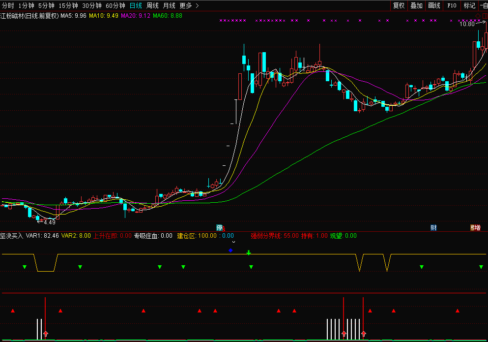 上升在即: IF(CROSS(VAR1,VAR2),50,0),STICK,COLOR0000CC,LINETHICK2;