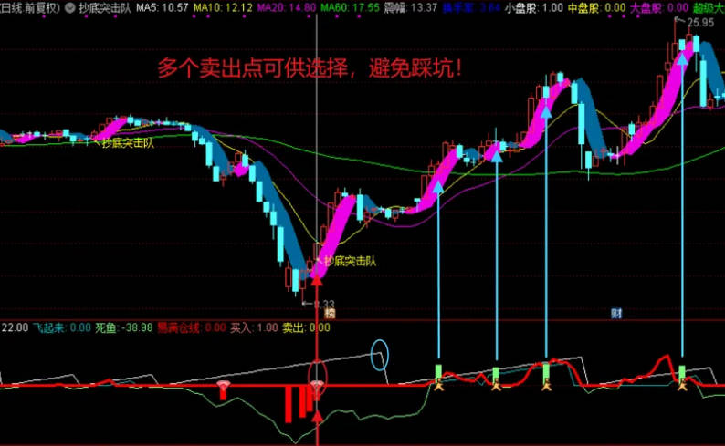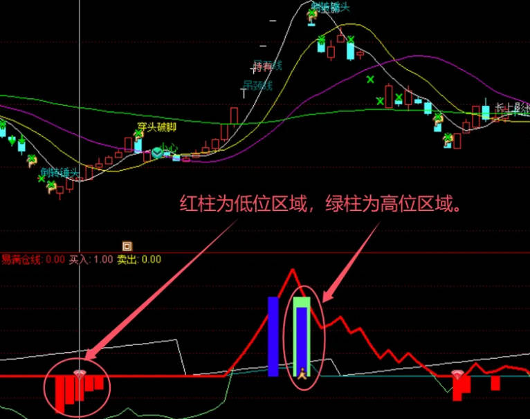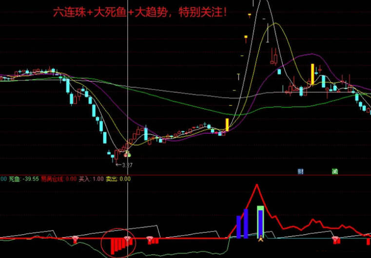 【第2套信号】红柱表示低位区域,特别是多连珠+大死鱼(死鱼线数值较大)+大趋势(大趋势线数值较大),可以可以买入;出现绿柱,特别是蓝柱套绿柱,必须及时卖出。