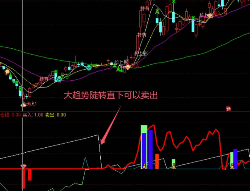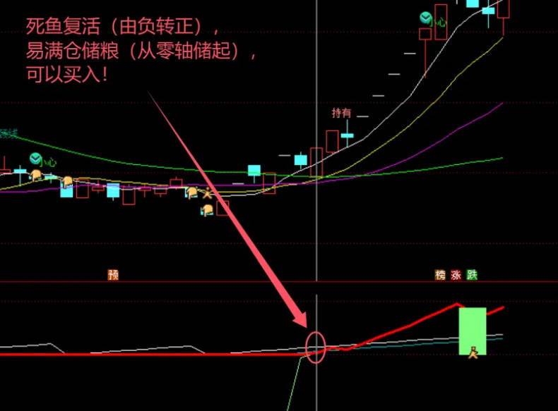 【第3套信号】死鱼线消失在零轴线,红色的易满仓线从零轴线向上运行,似乎是死鱼涅槃,一跃而起,扶摇直上之时,可以买入;大趋势线上升途中急转直下,建议在拐角处卖出。