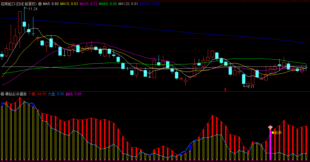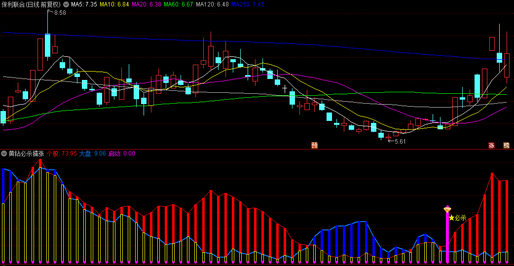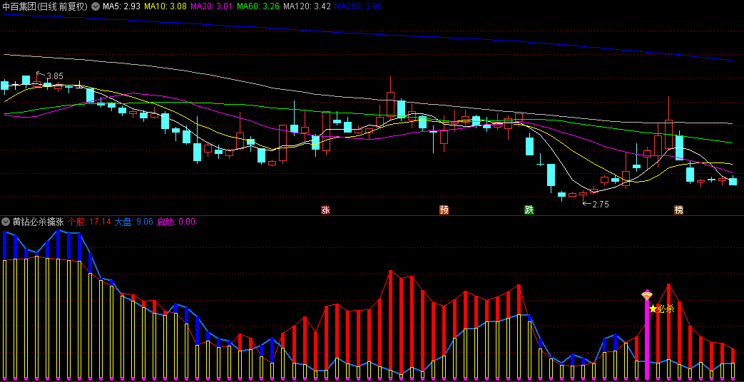 图中重要的一个信号就是黄钻,出现黄钻,意味着股价位置突破了大盘的位置,同时会标注“必杀”字样,把柱子加粗变色变为实体显示,这样是方便分辨;