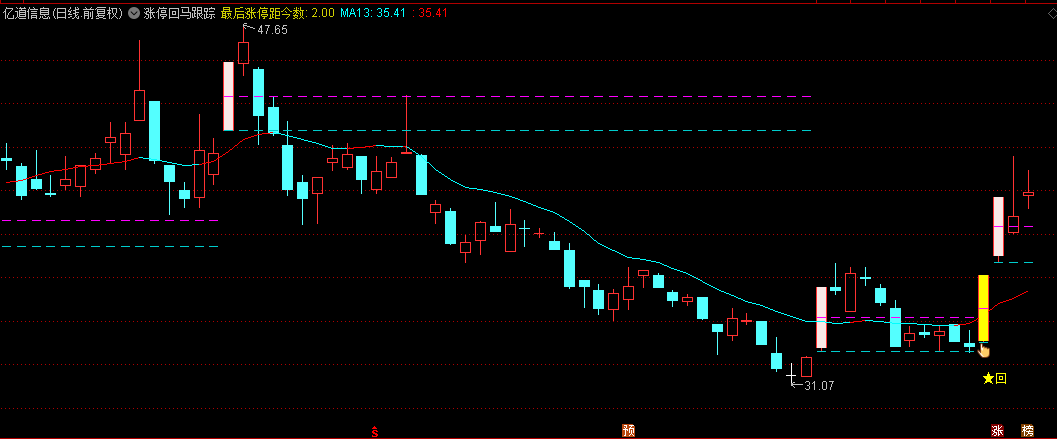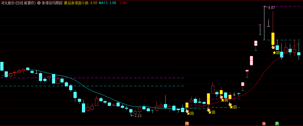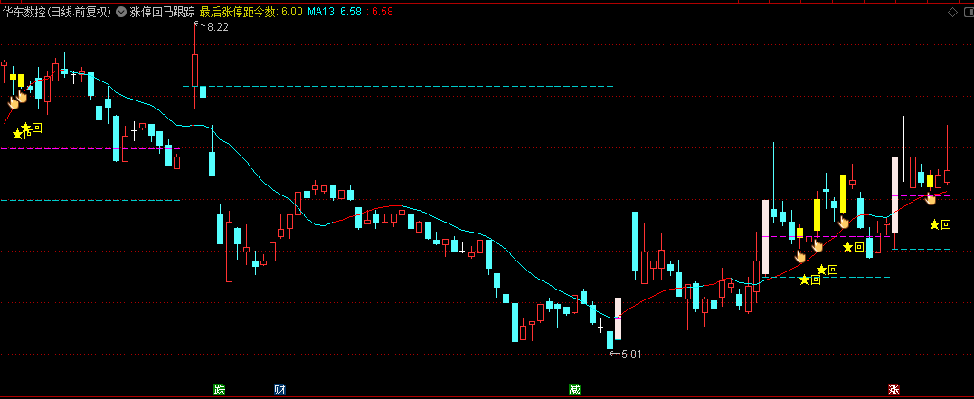 【涨停回马跟踪】主图指标,监测回马枪过程,对二次拉升给出预警,源码分享
