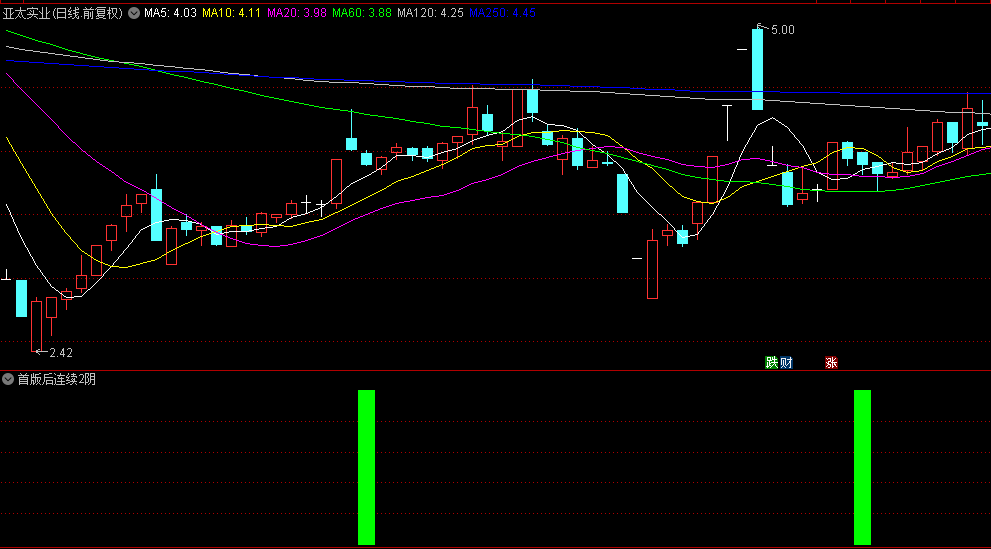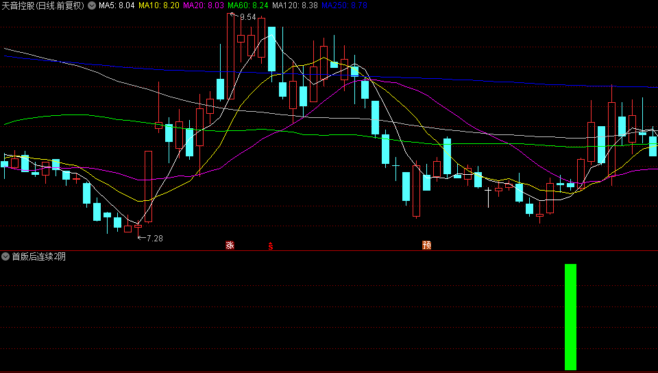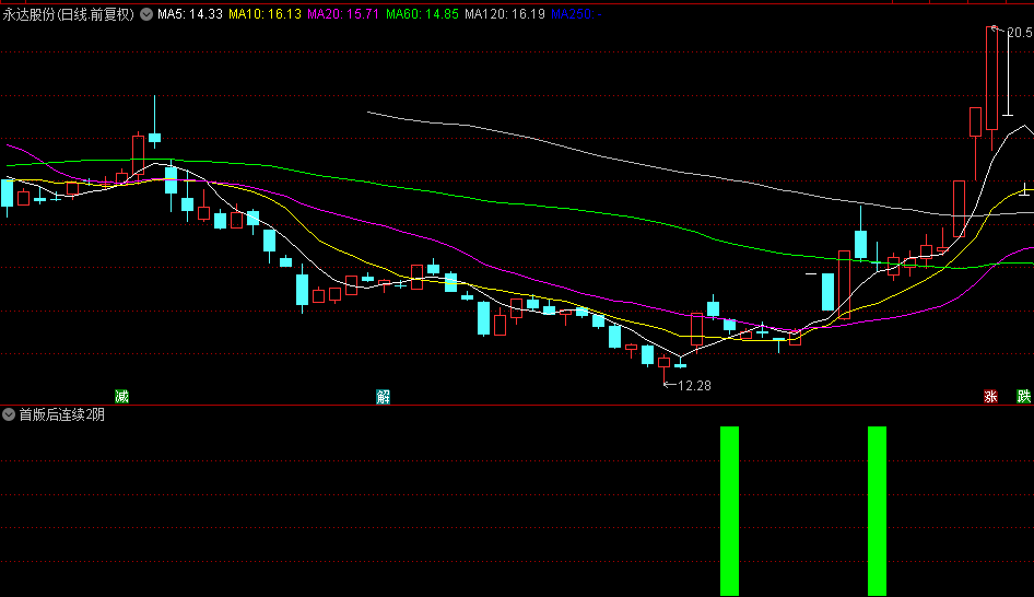 【首版后连续2阴】副图/选股指标,首版后,连续2阴,但收盘价没有跌破五日均线!