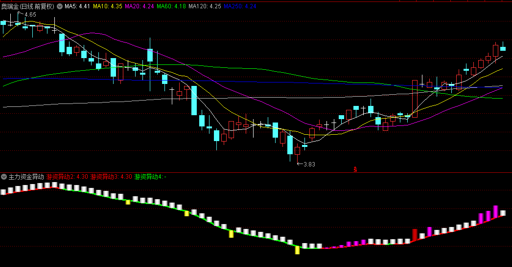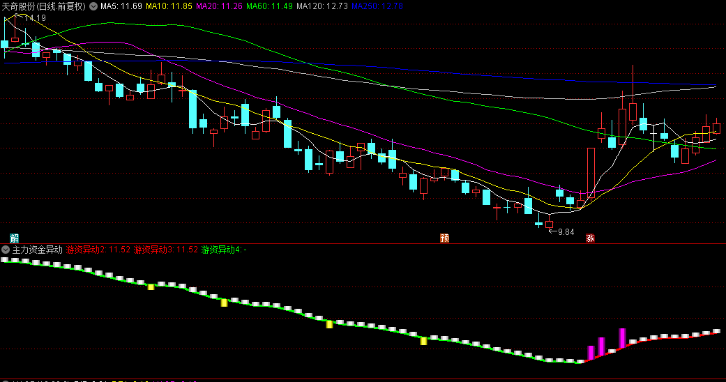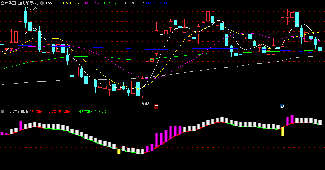 这是一个由:“向下的黄色柱、蓝色柱、向上的绿色柱、向上的紫色柱、红色柱”组成,用来提示资金异动,把握短期市场变化的指标。